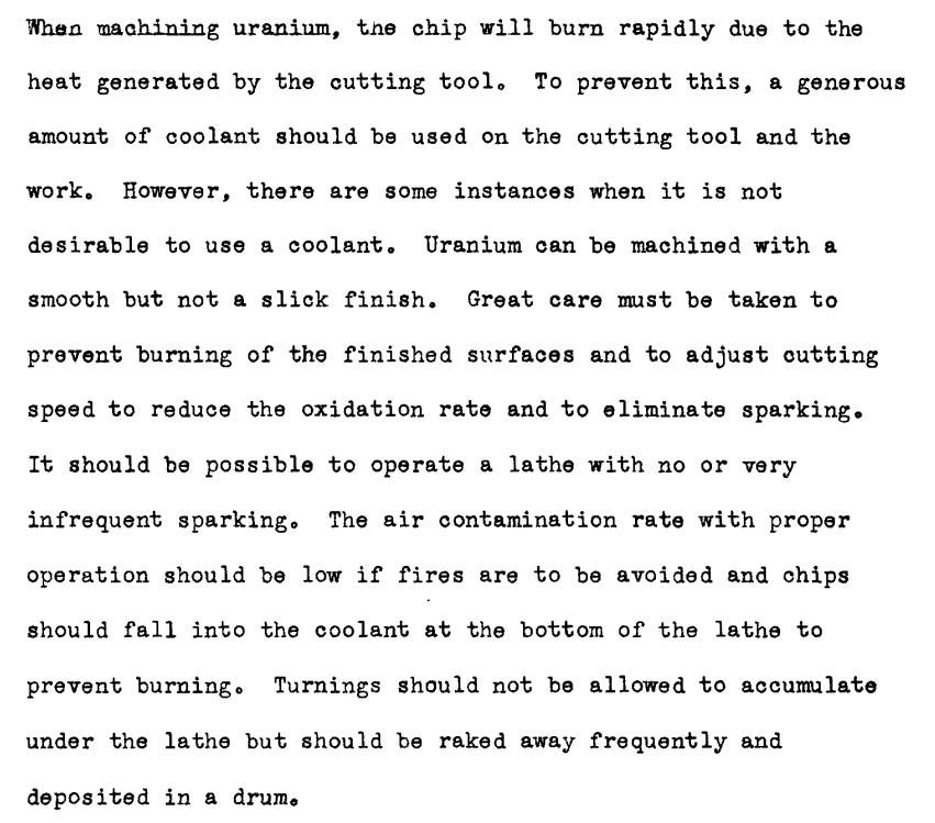 "Machining techniques and procedures for uranium, graphite, titanium, zirconium, thorium, tantalum, beryllium, bismuth, lithium, and stellite"