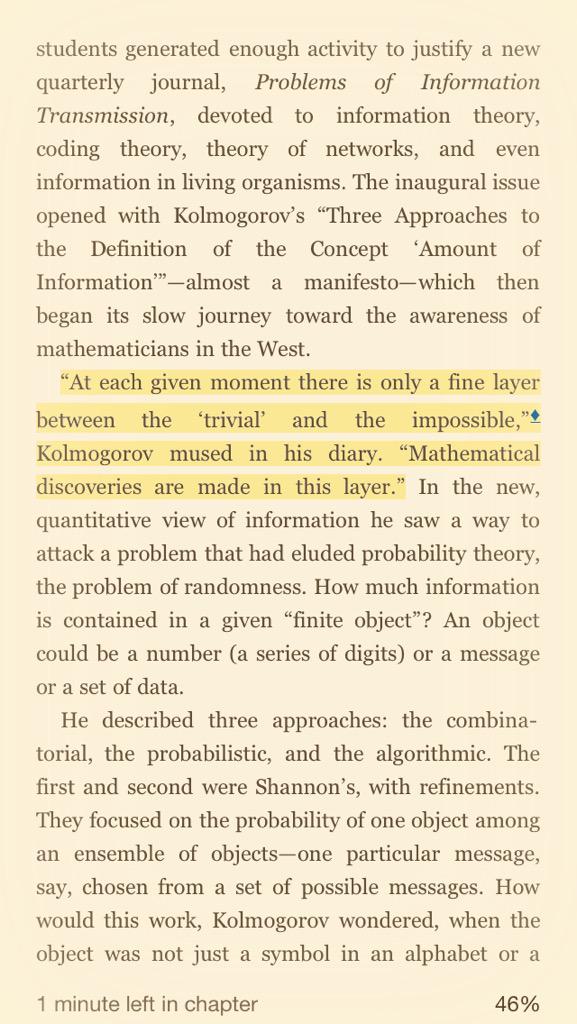 Kolmogorov via Gleick: “At each given moment there is only a fine layer between the ‘trivial’ & the impossible.”