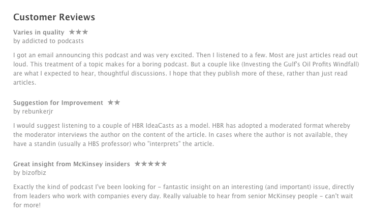 Who has gobs of time to *listen* to a McKinsey podcast VS scanning article? “Most are articles read out loud”?