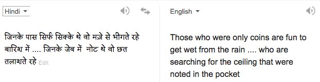 Venkatesh Rao@vgr·Sep 14, 2016Funny account to follow if you can read HindiQuote TweetHindi@mithelesh·Apr 2, 2015जिनके पास सिर्फ सिक्के थे वो मज़े से भीगते रहे बारिश में .... जिनके जेब में नोट थे वो छत तलाशते रहे .... #mbaria22