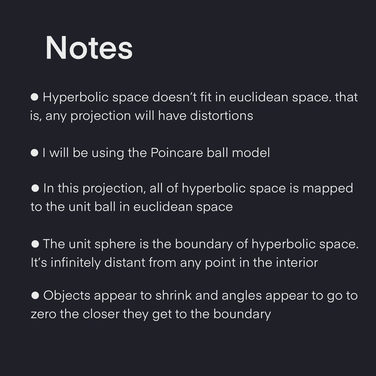 The last bullet feels off. Since the Poincare ball model is conformal, it preserves angles everywhere. For example, angles don’t change towards the boundary in your translating cube below. Maybe the claim is about interior angles of polygons as their size increases (?)