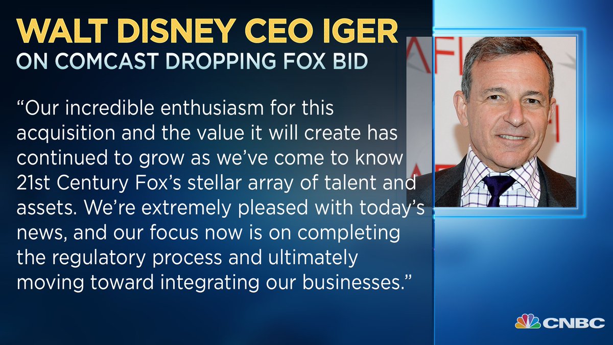 JUST IN: Walt Disney CEO Bob Iger says the company is "extremely pleased" with today's news that Comcast is dropping its bid for Fox's assets. https://cnb.cx/2NvmHcx pic.twitter.com/XoztT2JpNs
