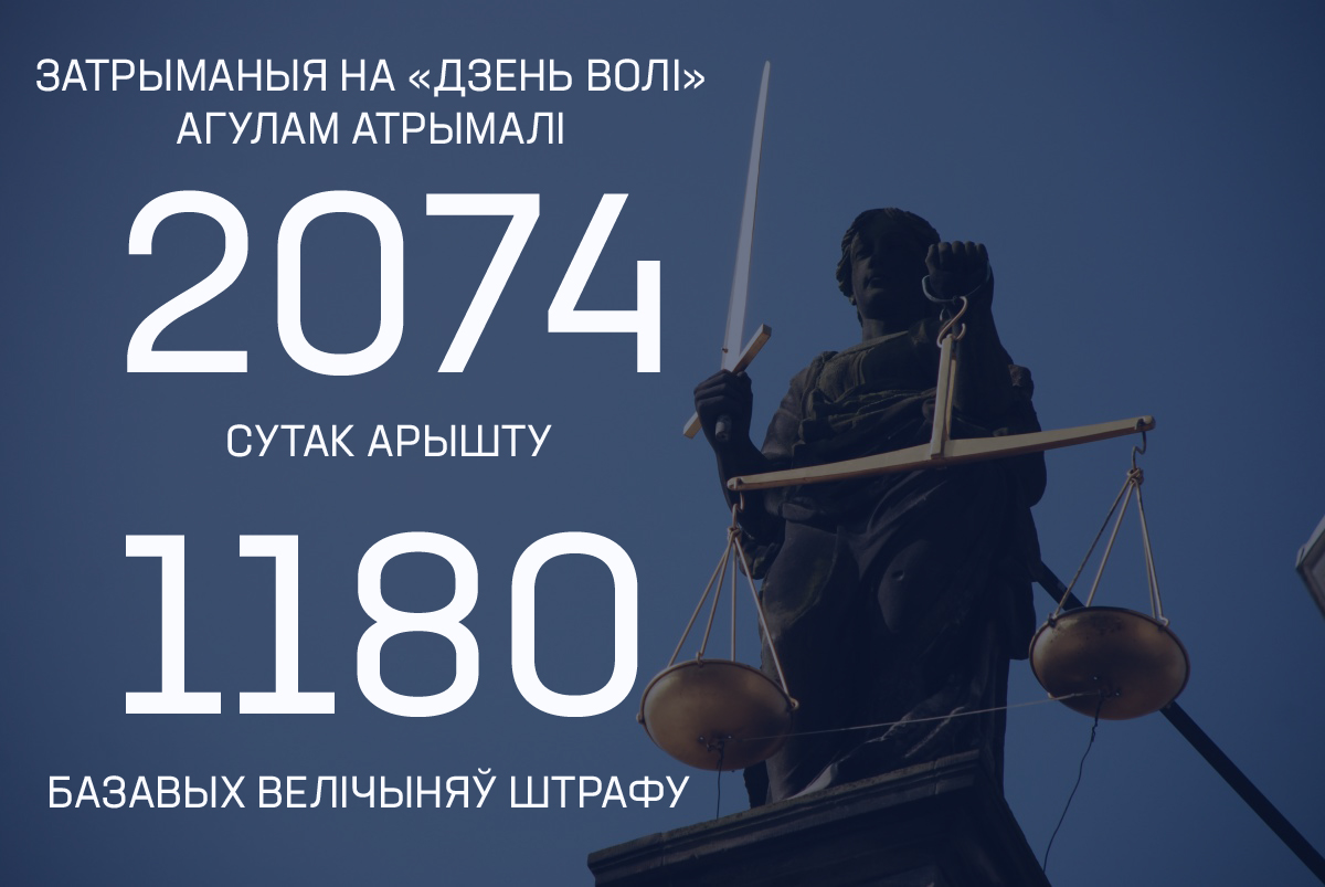 Арыштавана 120 чалавек на 2074 сутак (у сярэднім кожнаму ≈17 сутак). 12 чалавек атрымалі штрафаў на 1180 базавых велічыняў (у сярэднім па 98 базавых «на чалавека»).