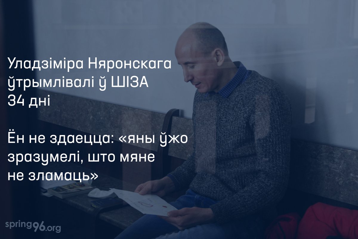 Палітвязня Уладзіміра Няронскага ўтрымлівалі ў ШІЗА 34 дні Акрамя гэтага, палітвязня пазбавілі прадуктовых перадач да 4 жніўня. У калоніі яму за працу плацяць 2 рублі ў месяц Але Уладзімір не здаецца: ходзіць у храм і перадае: «яны ўжо зразумелі, што мяне не зламаць»pic.twitter.com/p1Dv6GX0zT