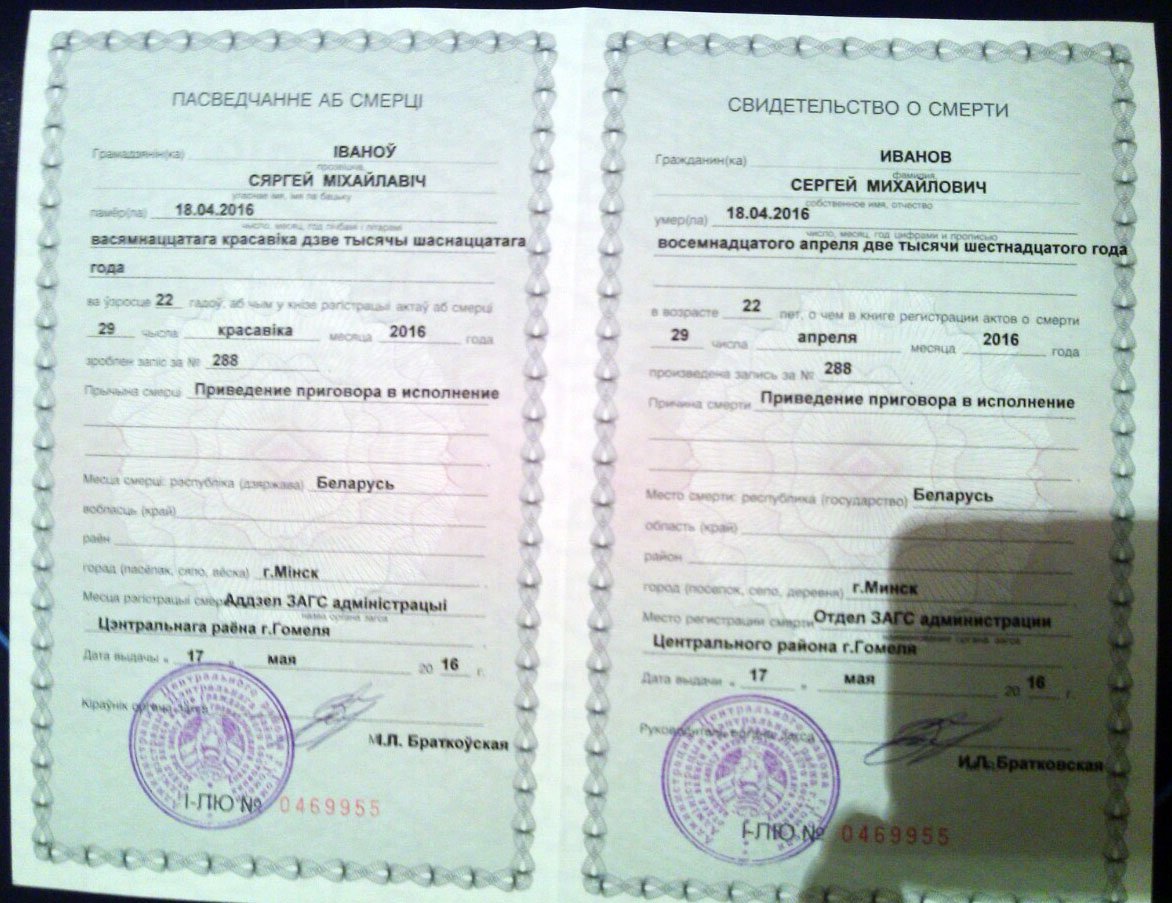 У пасведчанні аб смерці Іванова пазначана: “Прывядзенне прысуду ў выкананне” https://spring96.org/be/news/83144 #deathpenaltypic.twitter.com/jLi4L5AIVL