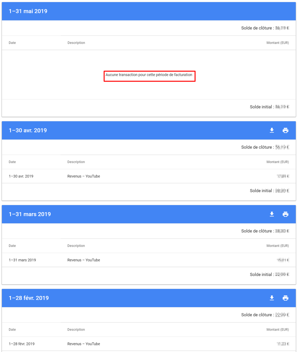 J'ai masqué les montants, mais on voit bien que le montant indiqué pour le mois de Mai (sur YouTube) n'apparaît pas sur AdSense.pic.twitter.com/uxYRwbPEm2