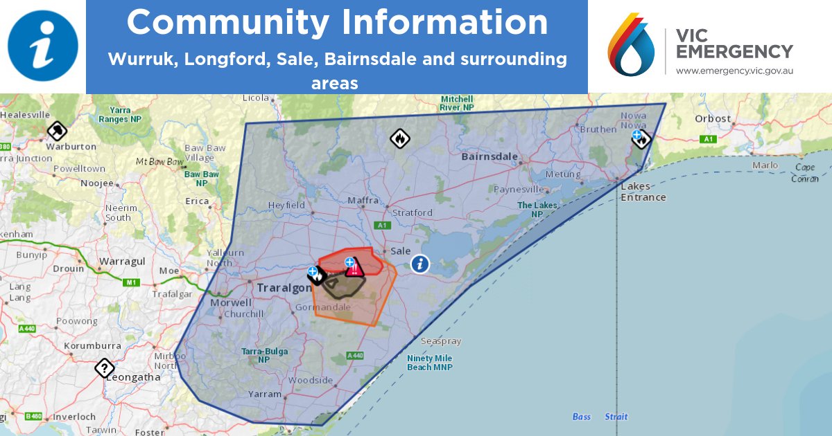 Community Information: There is a bushfire at 6.3Km South of Rosedale. The fire is generating a large amount of smoke and ash that will be noticeable particularly in Wurruk, Longford, Sale, Bairnsdale and surrounding areas. http://emergency.vic.gov.au/respond/#!/warning/5693/moreinfo …pic.twitter.com/77HTLVBvN1