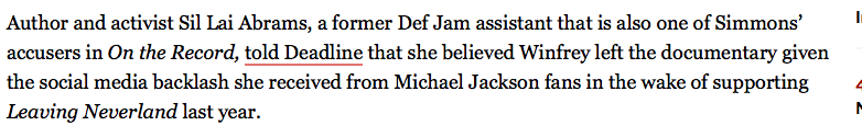 .." Sil Lai Abrams, a former Def Jam assistant that is also one of Simmons’ accusers in On the Record, told Deadline that she believed Winfrey left the documentary given the social media backlash she received from Michael Jackson fans in the wake of supporting (LN) last year."https://twitter.com/andjustice4some/status/1224548991758585856 …