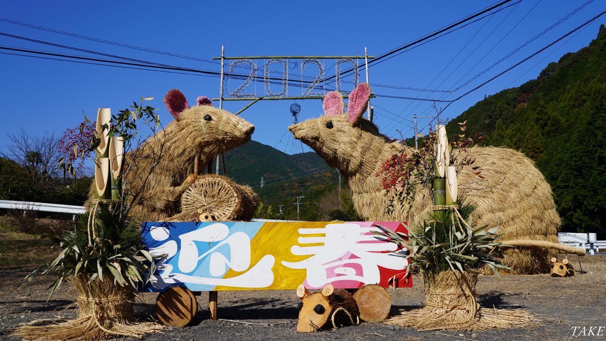 静岡県島田市大代に2020年の 「子」のジャンボ干支を 見に行って来ました 地元の村おこしグループの方が 間伐材に竹や藁を使い 一番大きな父親ネズミは 全長4.5m高さ3.5mもあり 母ネズミと3匹の子ネズミと 可愛らしいネズミ一家を 表現された作品でした 会場は大いに賑わっていました