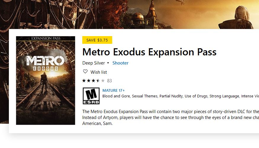 Metro Exodus Expansion Pass (X1) $21.24 via Xbox Live. http://ow.ly/10FZ30qeJog pic.twitter.com/Mlobc7VEyZ