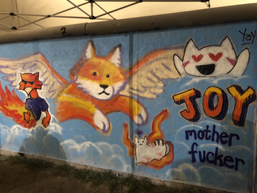 3:30AM: shakes cane at train horn (?) blaring repeatedly for 1 min and giant crowd of revelers running past apartment. goddammit portland