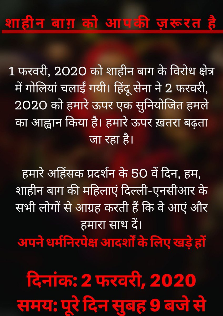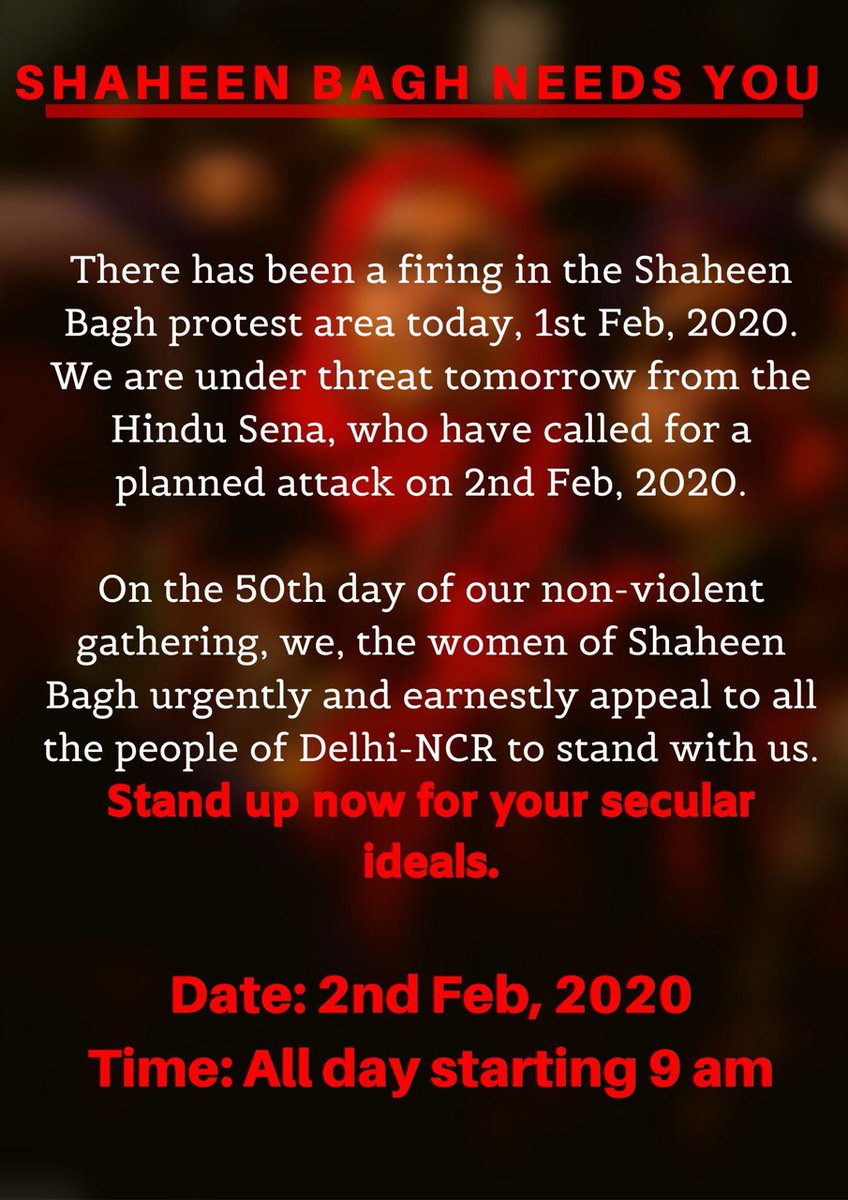 #shaheenbagh call for urgent mobilisation for 2nd February 2020. We will not be deterred by threats from Right-Wing groups in our fight to protect the Constitution. Please join us.#ShaheenBaghProtest#shaheenbaghattackedpic.twitter.com/dz95s3SV7N