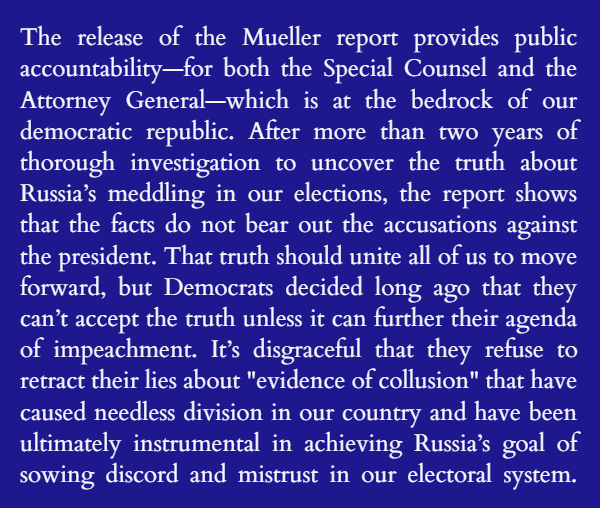 With all due disrespect, the redacted report has been out for less than 24 hours, now very clear our President was corrupt, lied, obstructed justice. Mueller report states POTUS not cleared. Disgusting to watch GOP minions abrogate their duty & shield corrupt POTUS. SHAME ON YOU!