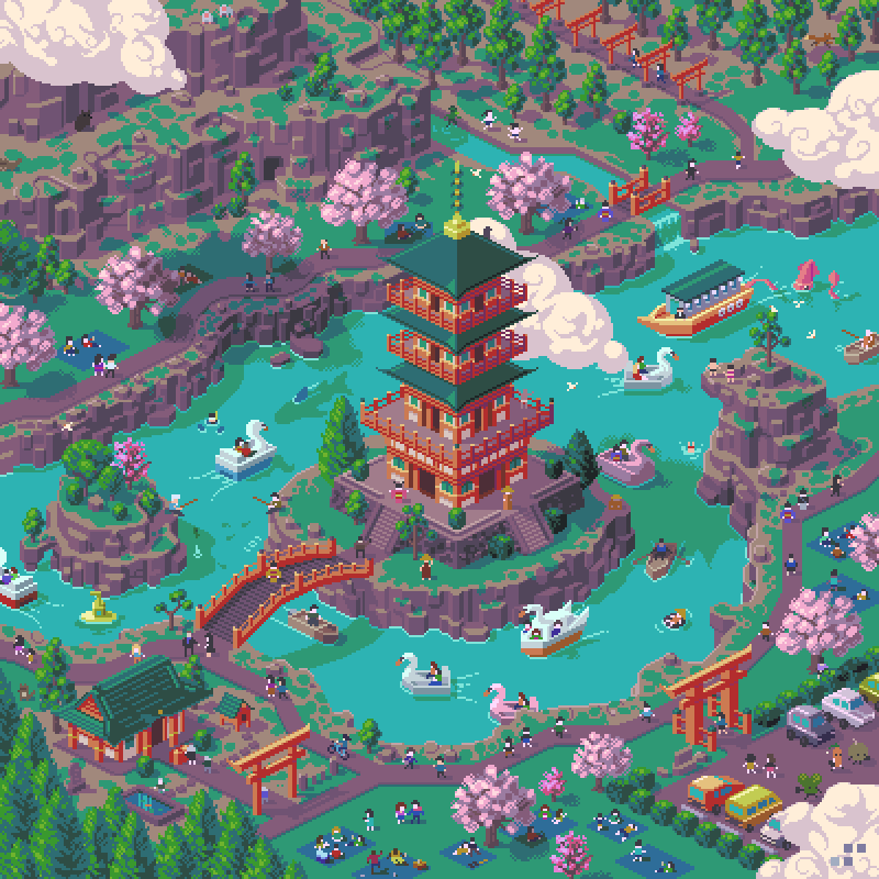 Mondo. Isometric pixel art series created over 4 months, approximately 50 hours in each piece. All available as merch==>https://rdbl.co/2AuWlpE  #pixelart #pixelweeklies #mondo #japan #isometric #gamedev #indiedev #ドット絵 pic.twitter.com/X2VB1k5ey3