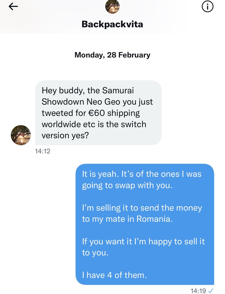@backpackvita is trying to scam people. He tried to scam me out of a game I was selling for charity. He also scammed other people in the community. Don’t trade with people you don’t trust. Share far and wide please.@ToysTyrant@vitagamergeorgepic.twitter.com/JrqE7yS8sC