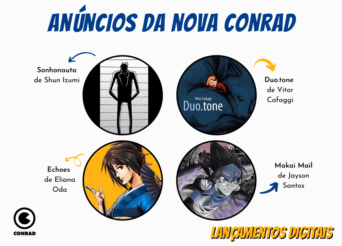 Ontem, rolou uma live da Conrad com várias novidades, 2ª) lançamentos nacionais de gibis em formato digital, inicialmente serão 4 títulos já previstos para 2020: Echoes da Eliana Oda; Sonhonauta do Shun Izumi; Makai Mail do Jayson Santos e Duotone do Vitor Cafaggi