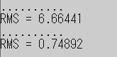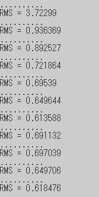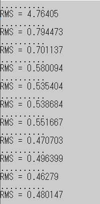 【ハーブギャモンNN】100試合(約4千局面)の学習データをシャフルしつつ10回学習させてみた。結果は添付画像の通り。目標は RMS = 0.25 以下なので、まだまだですな。pic.twitter.com/D9tsNHZfvD