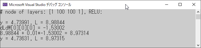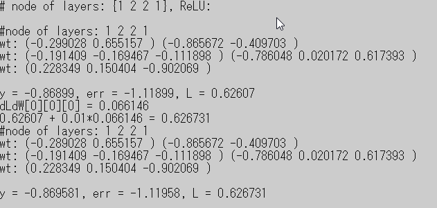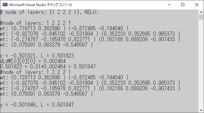 【ハーフギャモンNN】ReLU で学習すると重みが発散する件:念の為に5層の場合でも微分が正しいかチェックしてみた。pic.twitter.com/7BobHEnoZC