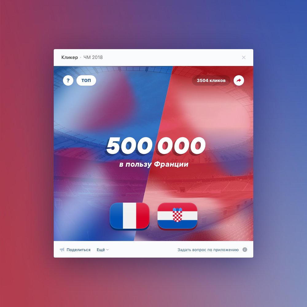 Битва фанатов в новом приложении «Кликер»! Выберите команду, за которую болеете, — Францию или Хорватию — и кликайте за неё как можно больше. Победит сборная, которая первой наберёт 10 миллионов кликов. Открыть приложение: http://vk.com/app6428493_-58810575 …pic.twitter.com/Yr6CfRgrgC