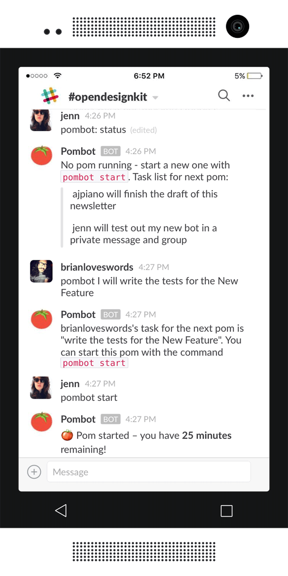 #pomodoro on in Slack w teammates using Pombot!@jennschiffer made & blogged it: https://bocoup.com/weblog/pom-circumstance-announcing-pombot-for-tracking-time-and-productivity-in-slack …pic.twitter.com/3PH1WQxIRi