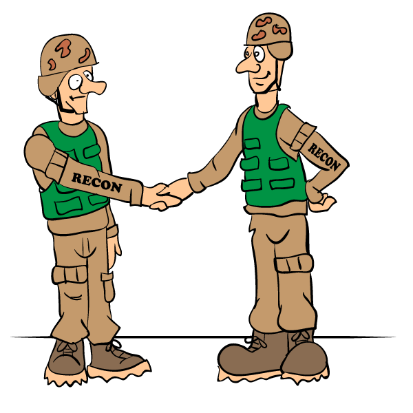 Reconcile. To restore friendship. These RECON team members have RECONciled after their argument.