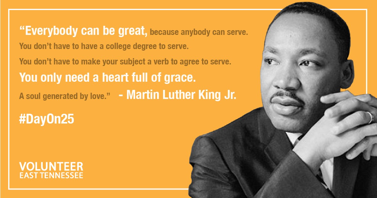 So, as you head out this #MLKweekend be sure to share your stories of service using#DayOn25 &#VolunteerETN. Or tag us@VolunteerETN.pic.twitter.com/AUgov9U9Ij