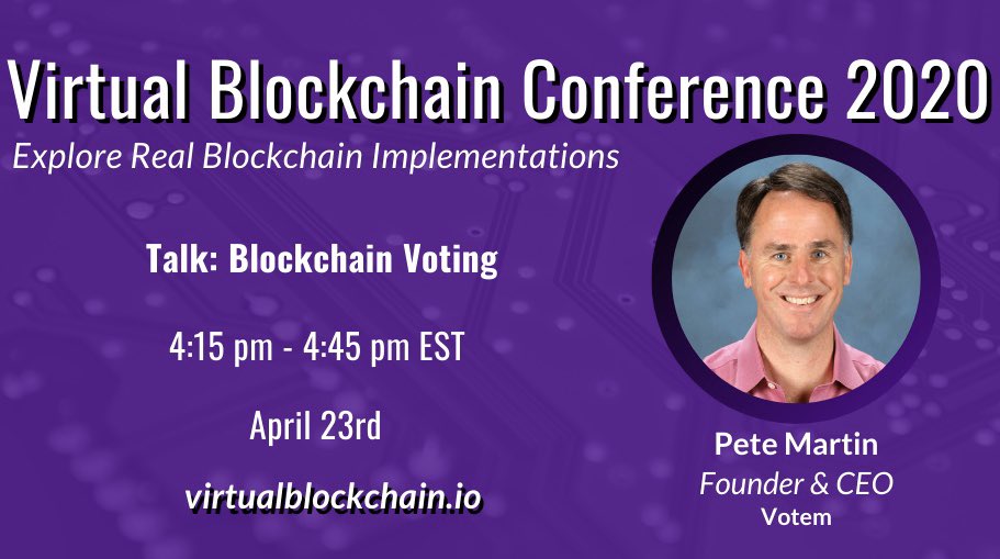 The next speaker we would like to introduce is Peter Martin. Pete Martin is the Founder & CEO of Votem, a Blockchain-based mobile voting company and he is the author of the upcoming book, "Sparking a Mobile Revolution; How Mobile Voting Will Change the World as We Know It”.pic.twitter.com/YK8Zsc5NFl