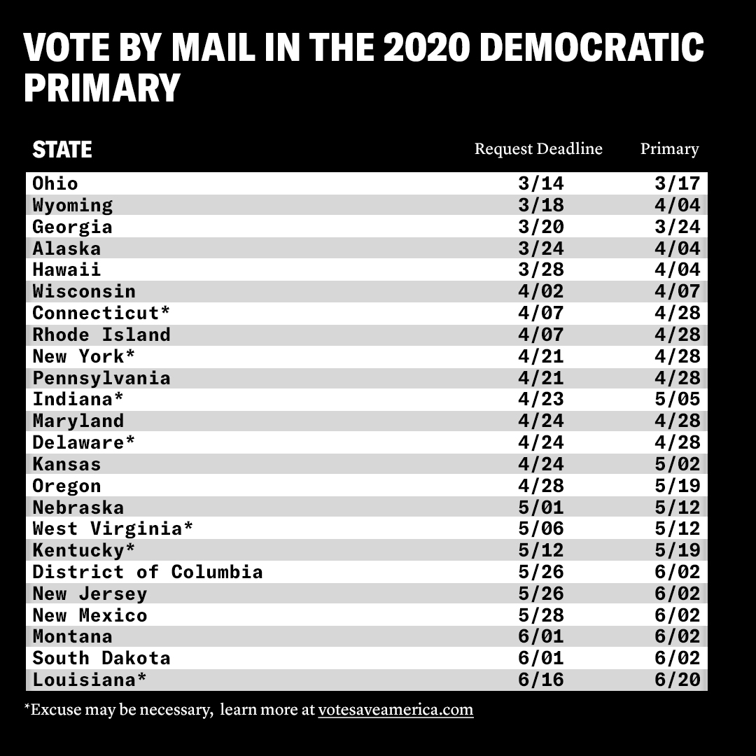 Hawaii is incorrect: it's vote by mail for *everyone* who registered by March 8th, and must be *received* by April 4th. If you didn't get a ballot by mail, you must vote in person (you can do walk-in registration). Details here: https://hawaiidemocrats.org/wp-content/uploads/2020/03/APRIL-4th-LOCATIONS.pdf …