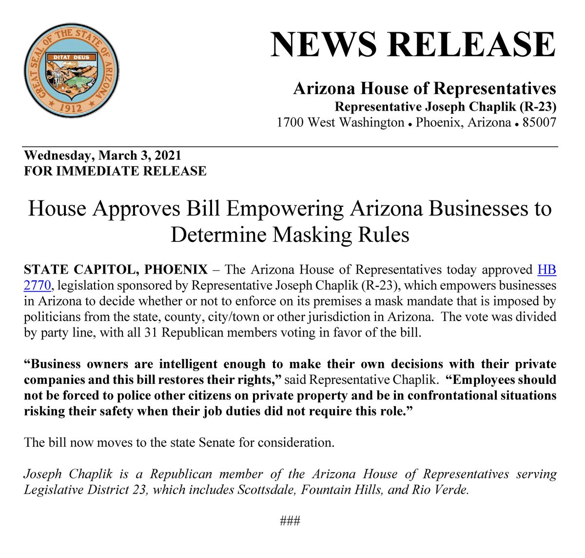 House Approves Bill Empowering Arizona Businesses to Determine Masking Rules. https://www.azleg.gov/press/house/55LEG/1R/210303CHAPLIK2770.pdf …