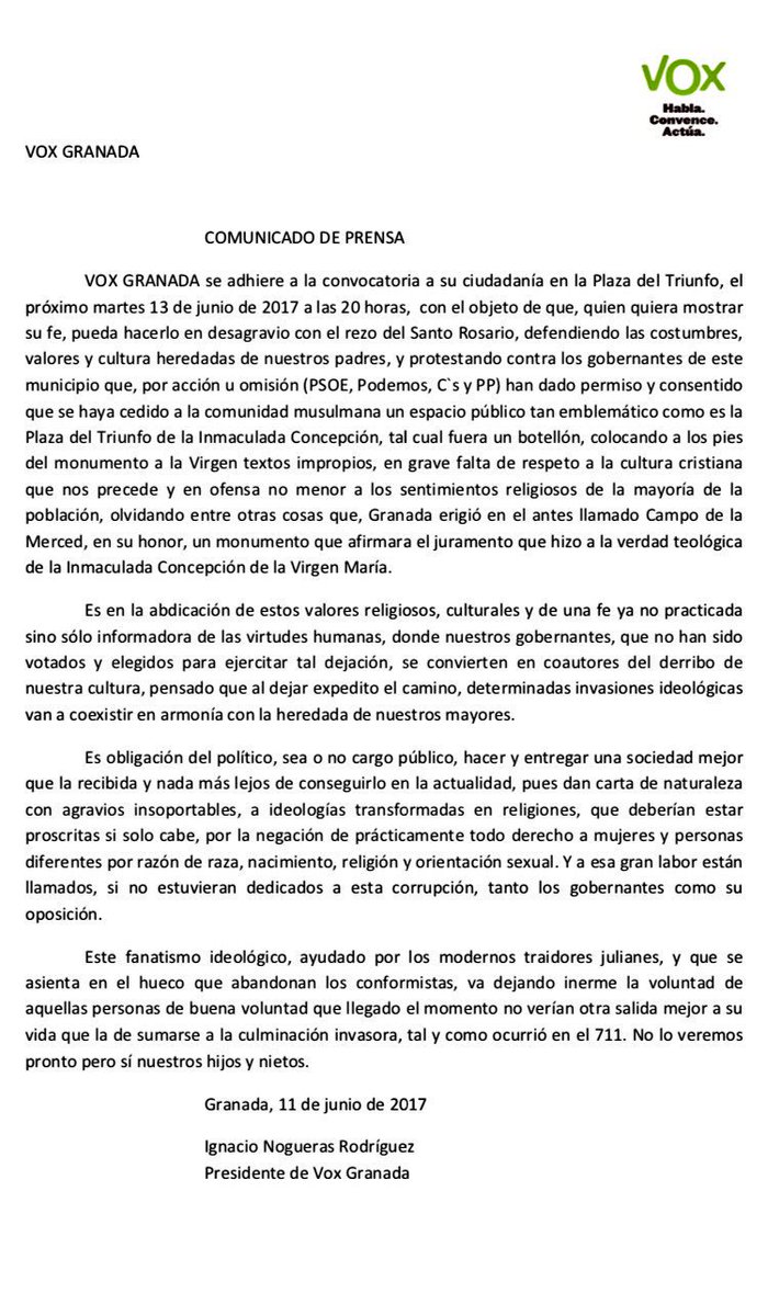 Comunicado de @vox_granada ante el agravio de ceder la plaza de la Virgen al culto por el Ramadán. El@PSOE se luce y el@PPopular callapic.twitter.com/rLIsC0iFFL