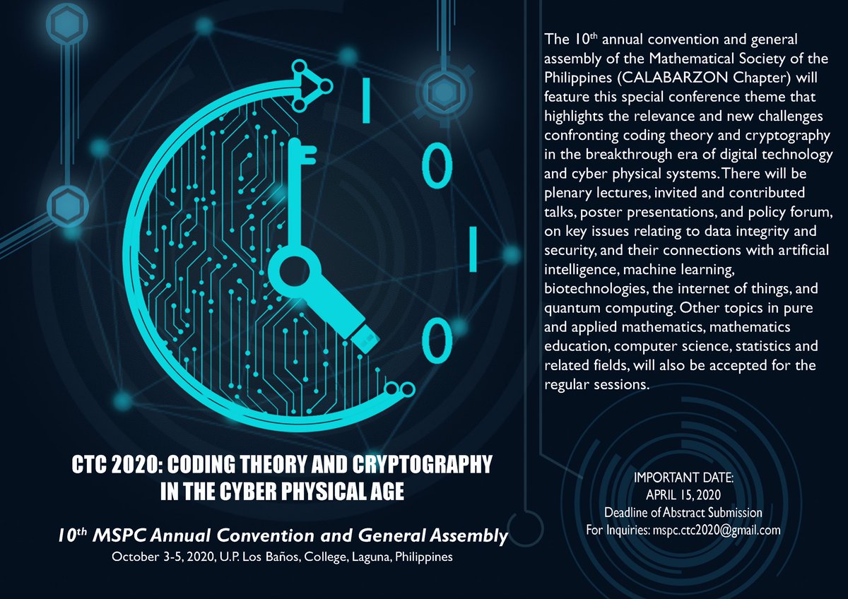 Save the dates! 3-5 October 2020 U.P. Los Baños CTC 2020: Coding Theory and Cryptography in the Cyber Physical Age —and— MSPC 2020: The 10th Annual Convention and General Assembly of the Mathematical Society of the Philippines Calabarzon