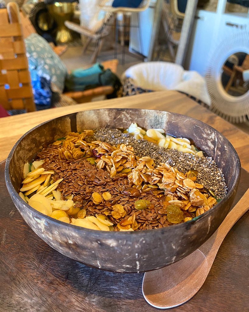 Spirulina Smoothie Bowl Frozen banana, pineapple, papaya, blended with spirulina powder, greek yogurt and coconut water, topped with granola, flax seeds, chia seeds, coconut flakes, mixed seeds and drizzled with honeypic.twitter.com/hueM0lSW6J – mjesto: Casa Consunji