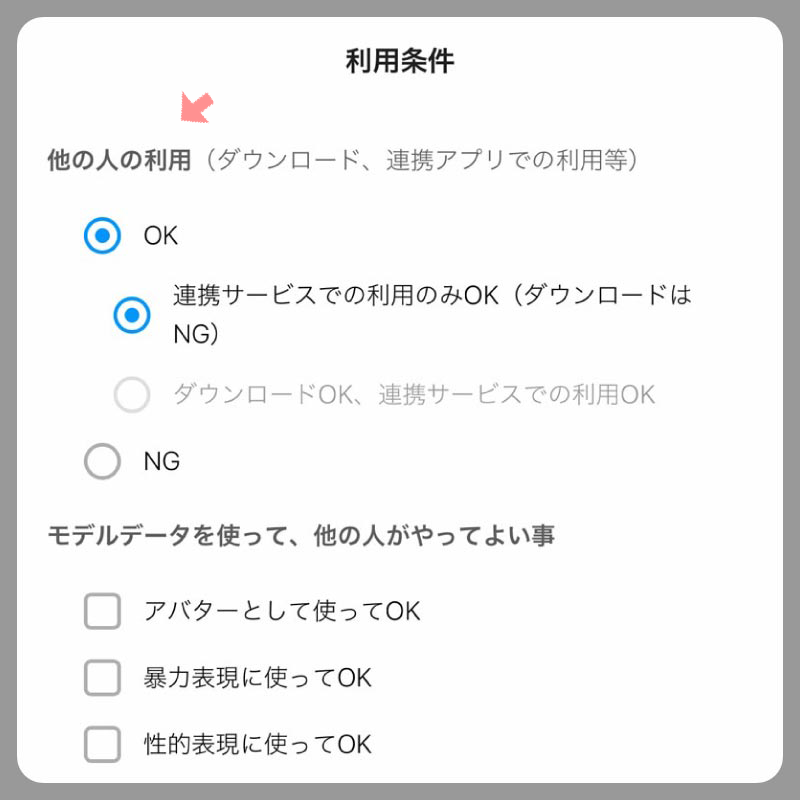 他の人に使ってもらいたいキャラクターは ①投稿画面で「利用条件を変更」ボタンを選択 ②「他の人の利用」をOKにして公開