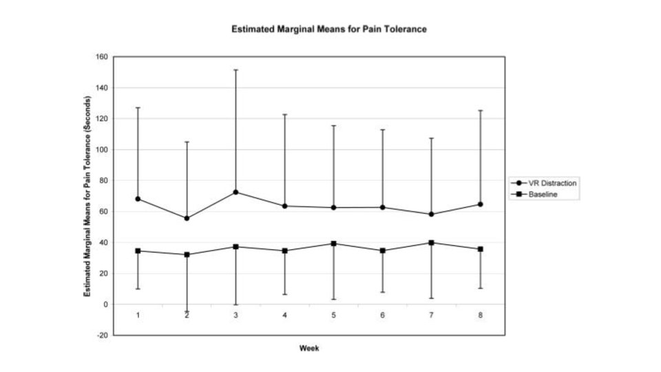 #VirtualReality wane over time? Do patients habituate to#VR like developing tolerance to#opioids? I've found several studies that say "no"; VR continues to work. Couple examples: Rutter et al (PMID 19231295) on left, Hoffman (PMID 11587113) on right.pic.twitter.com/ME1O09Xqsm