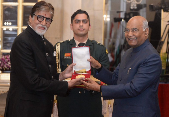 @SrBachchan ji on receiving the prestigious#DadasahebPhalkeAward at the hands of Hon President#RamNathKovind ji !pic.twitter.com/toy9dlUh86