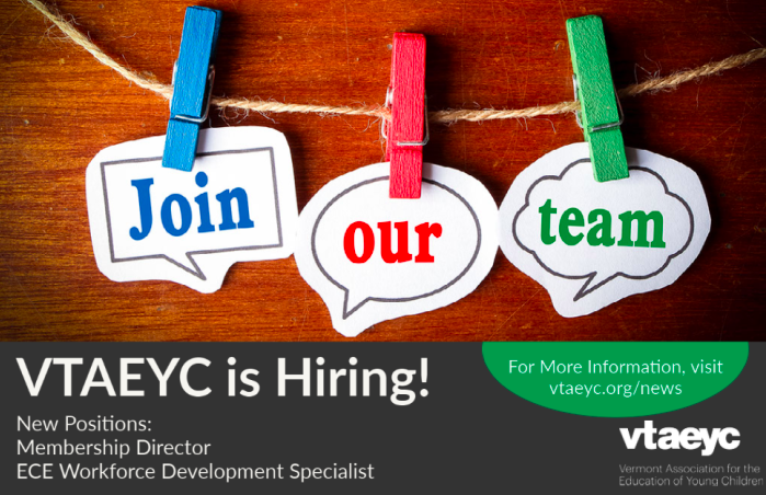 Vermont Association for the Education of Young Children (VTAEYC) is growing and hiring! They are adding a Membership Director and ECE Workforce Development Specialist. To read the full job descriptions, go to https://bit.ly/2RYIfWZ pic.twitter.com/BY9GXkxIKR