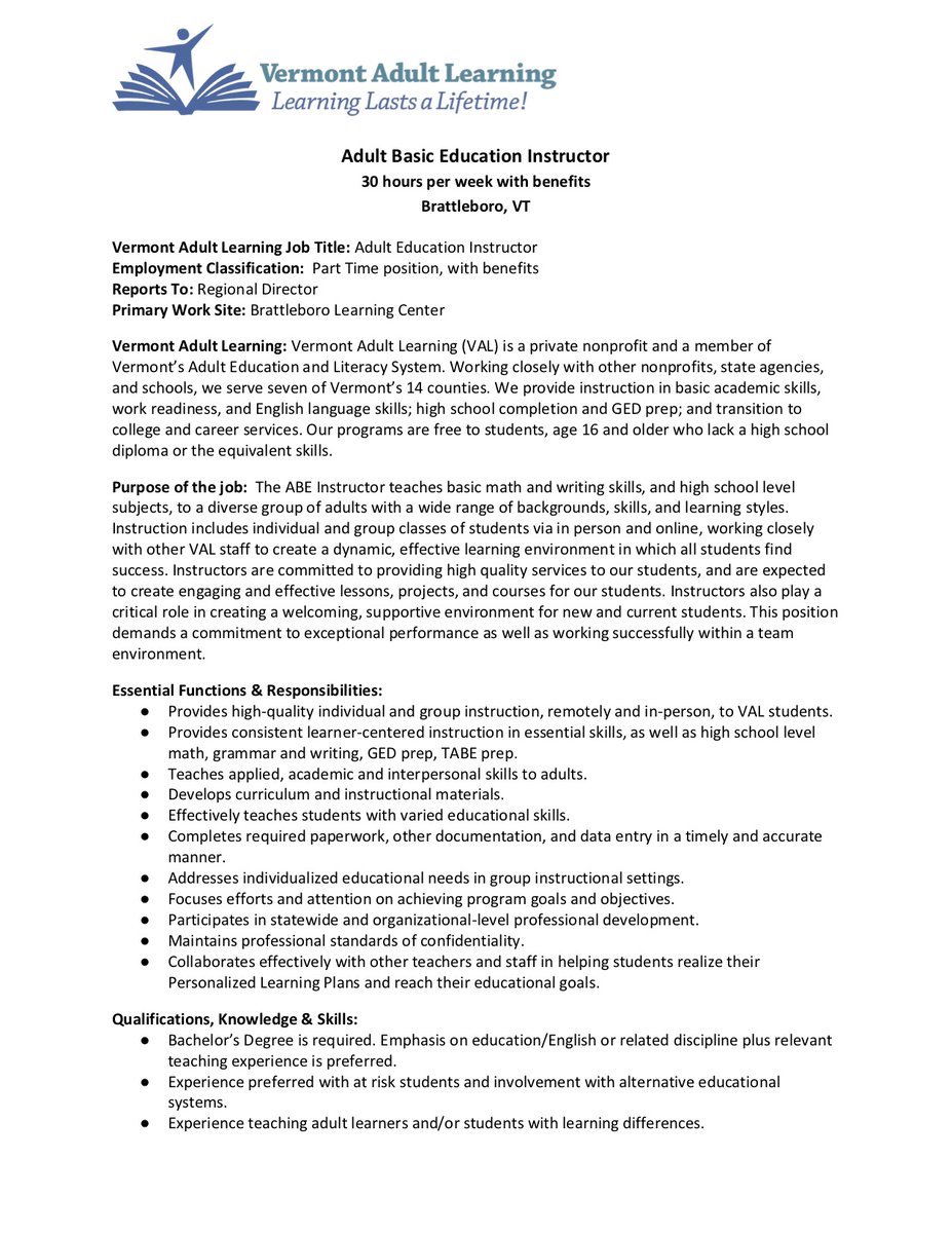 Vermont Adult Learning is hiring for two positions: Adult Basic Education Instructor and Education Advisor: Recruitment and Enrollment. Interested? Read the descriptions & instructions for applying below!pic.twitter.com/UxXaV4eWc9
