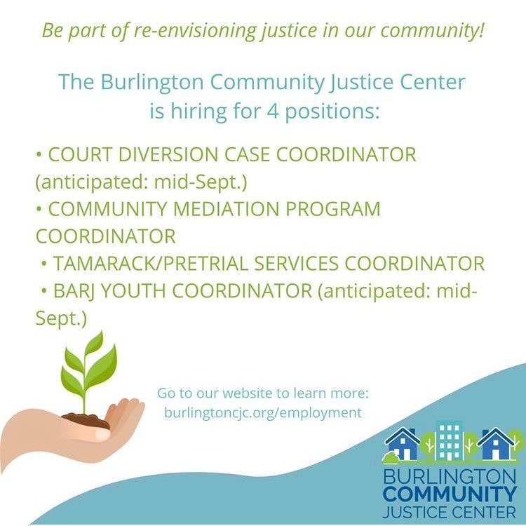The Burlington Community Justice Center is hiring for four positions! See all the positions below, or head to https://bit.ly/3gA8kEU to apply.pic.twitter.com/5Z7WtXAV4x