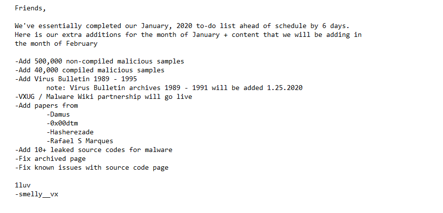 If you're a person/organization with an FTP- I will gladly upload the entire VXUG Malware Collection to your box. If you plan on monetizing our collection, I'd like to remind you that we are a non-profit and rely solely on donation.
