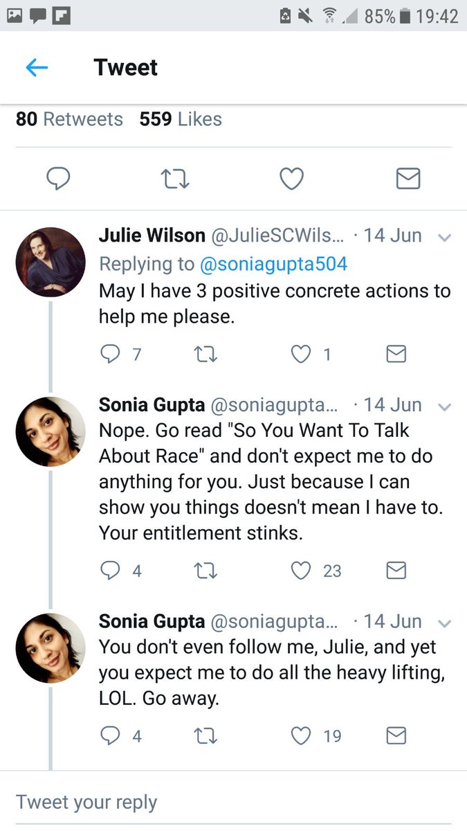 she literally says "I want to show you". the point here is that if you actually reply to the first tweet then you're a schmuck. what she really means is "look it up on Google". not sure why she can't just say that? there are so many good resources online nowadays