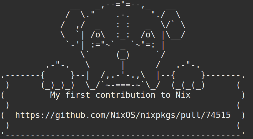 @nixos_org Great opportunity to learn and to do my bit at the same time. Just picked up a missing program in nixpkgs (that was the most difficult part) and made its derivation. The program is boxes, a nice utility to surround ASCII textpic.twitter.com/lyaa6NJcX0