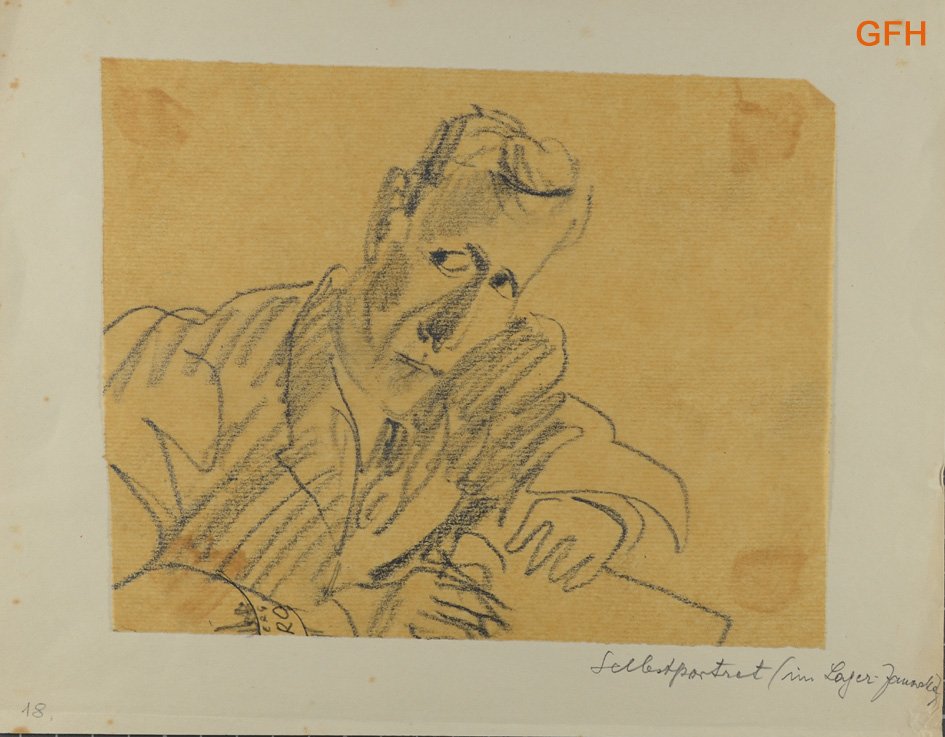 Porath's artwork was a courageous form of resistance during the #Holocaust. If his drawings of the camp had been discovered, he would likely have been executed. Here is a self-portrait which suggests his attempts to hide his work.pic.twitter.com/drwq0iWAkz