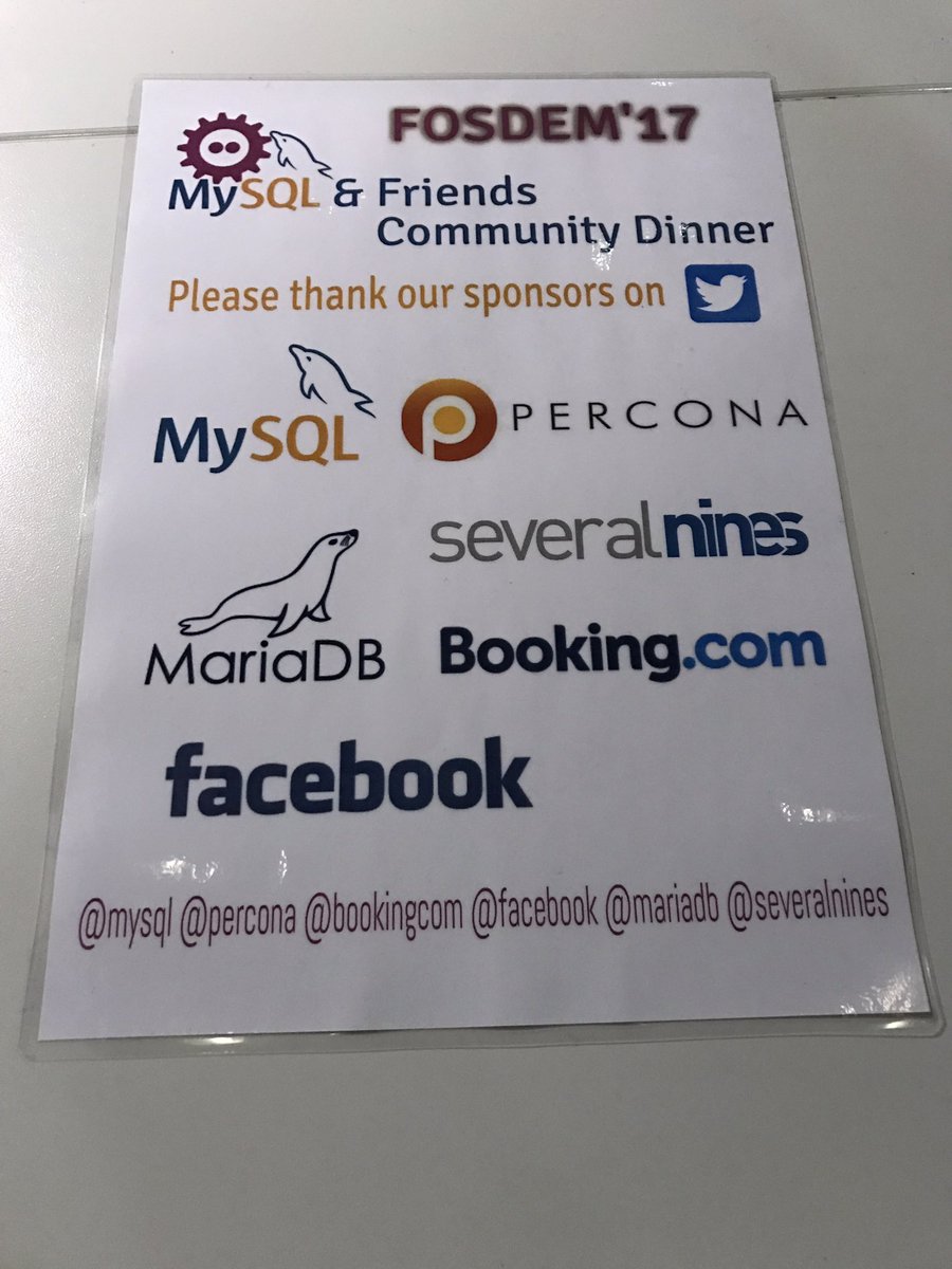 #mysqldevroom sponsors for wonderful community night@mysql@percona@bookingcom@planetbooking@facebook@mariadb@severalninespic.twitter.com/eSUHTpqhMl