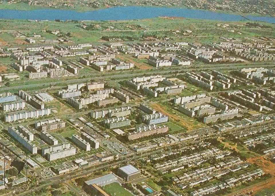 Bom dia, Brasília!!! Parece uma placa de computador mas na verdade é a Asa Sul em 1982. Já se localizou? Olha a Igreja Dom Bosco bem ali embaixo. As quadras 302 e 303 aparecem em primeiro plano. O que mais?