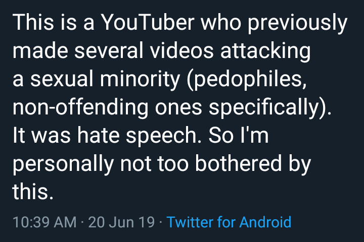 This is a YouTuber who previously made several videos attacking a sexual minority (pedophiles, non-offending ones specifically). It was hate speech. So I'm personally not too bothered by this.