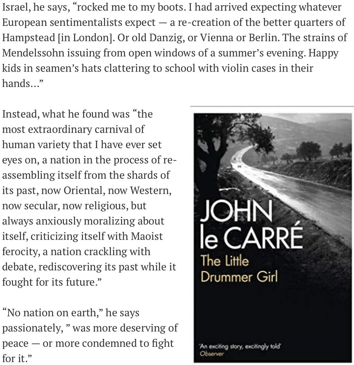 John Le Carre's description of Israel 23 years ago is still basically true. And the surprise at finding something different from an imaginary projection, even if different from the one he described, is remarkably common. https://www.timesofisrael.com/when-john-le-carre-poured-out-his-soul-on-jews-and-israel/ …pic.twitter.com/JqA55COJID