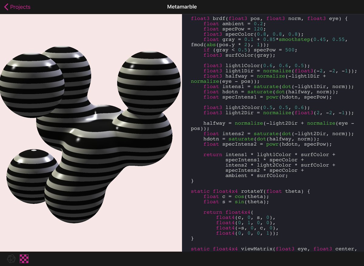 I open-sourced a little iPad app called Shadertweak that lets you live-edit Metal shaders. Same built-in uniforms as Shadertoy. https://github.com/warrenm/Shadertweak …pic.twitter.com/kYAx0H9PiO