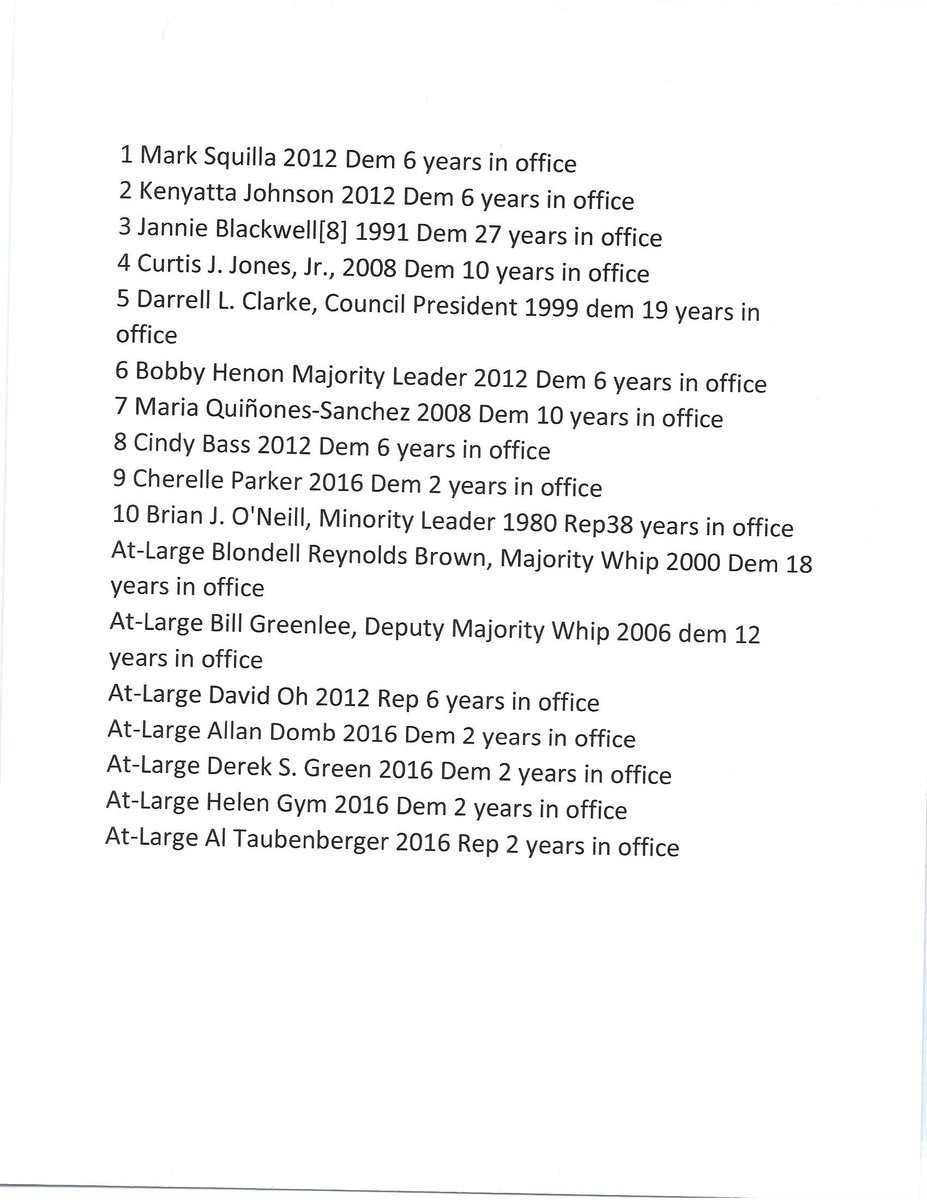 philadelphians,here is a list of our city council members.theses members have been an asset to philadelphia, they are responsible for the growth of our city,some have been here 10,19,27,and 38 years, these are are the best people we have.keep them in office,re-elect may 2019pic.twitter.com/UILUk45ivS
