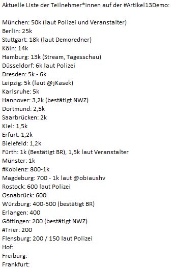 Wird weiterhin laufend ergänzt. Ich hab die Städte nun nach Teilnehmerzahlen sortiert. /TN